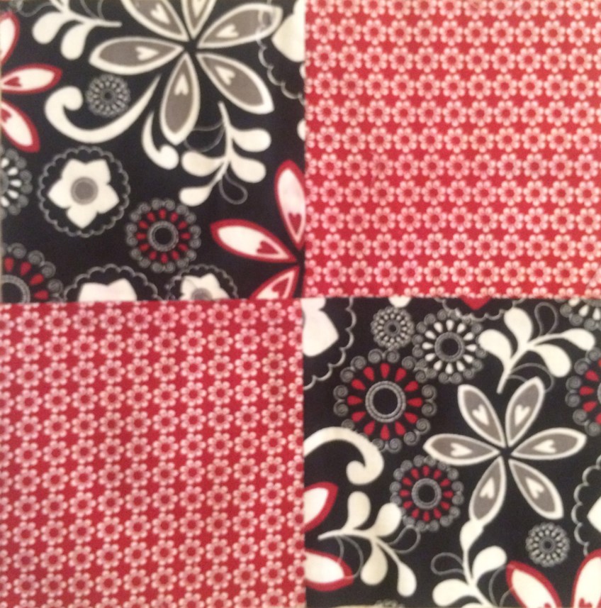 IMG_4186 Stashing sisters – Sisters keeper project quilt block Published 14 April 2014 at 2254 × 2280 in The Bluebird of Happiness – Retreat Part 3 of 3 4 square quilt block red and black floral
