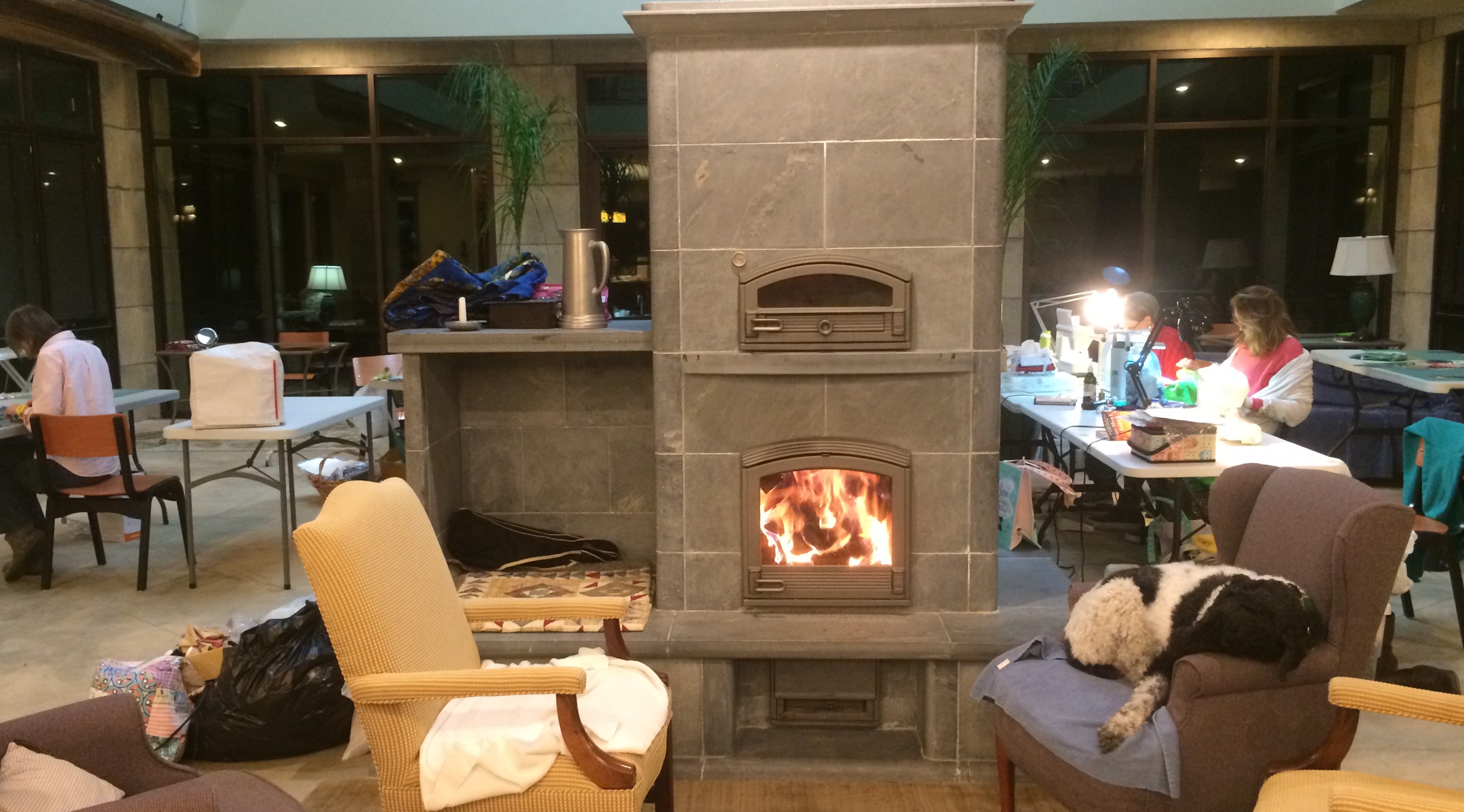 Stashers Quilting at the 2017 Retreat Published 28 March 2017 at 3123 × 1733 in Green and White – Retreat 2017 Stasher’s Mascot Enjoys the Warmth of the Fire