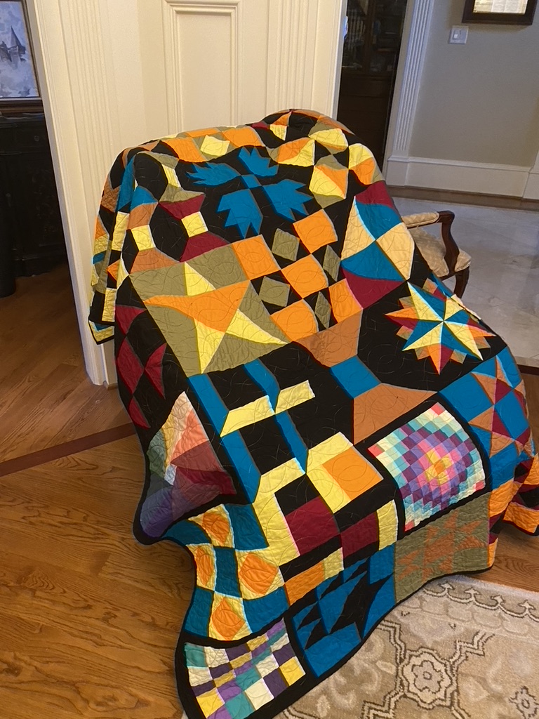 These blocks were old – maybe 20 years old and I made them. The math doesn’t seem to work out since I’ve been 25 for the last 20 years! Moving on, the point of this story is that these blocks were made and exchanged with a group of quilting friends. . . an Amish flavor with solid colors. They had seen a couple of moves, several closets, and still persisted. They found me several months ago when I was in a “get some projects finished” mental state of mind. So here they are. Backed with black Kona cotton which was no small feat. Since the pandemic, the elusive black Kona was as hard to find as snipes at a girl’s camp. The blocks are still alive and vibrant. Thank you sisters for having made colorful memories with me. Ginger