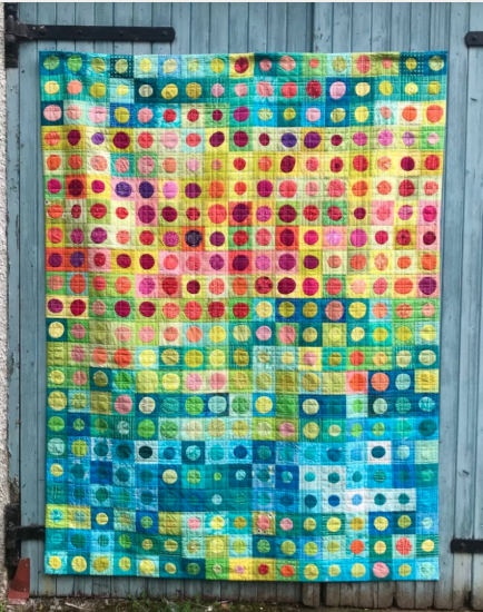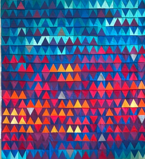 Using Kona Cotton, certain colors are assigned to represent a temperature range. The high and low temperature of each day is then recorded for a year. On days with less than 31 days, the row is completed with a filler color.